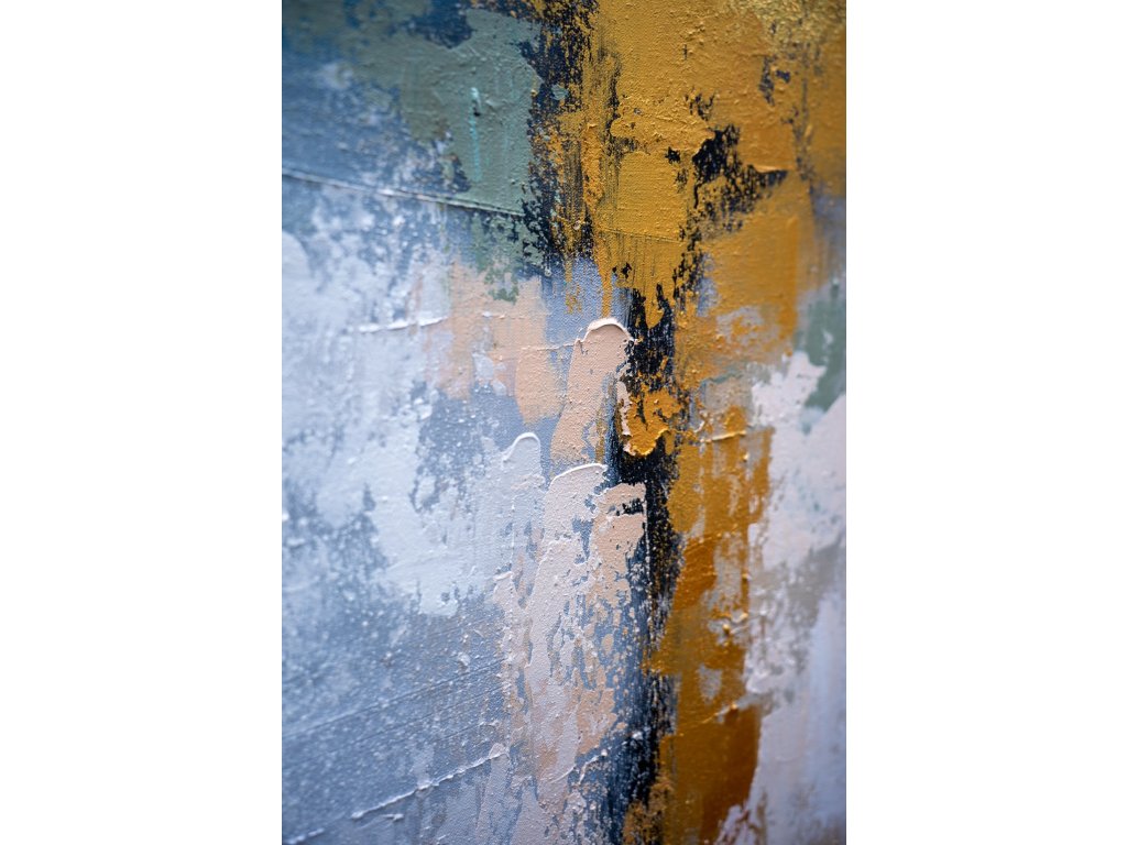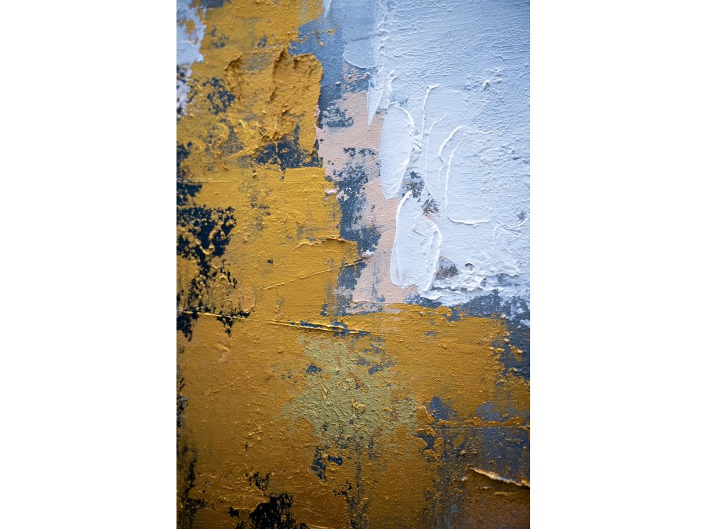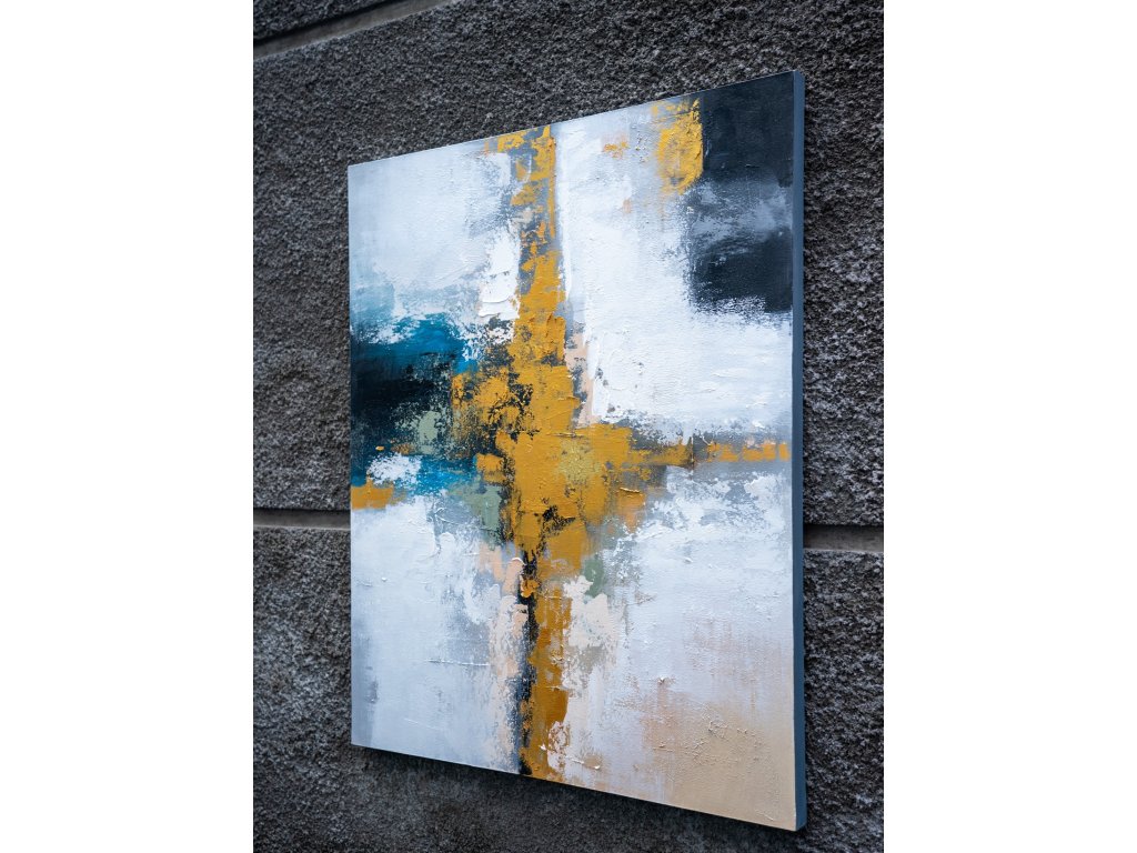 Abstraktní obraz Křižovatky ticha zaujme už na první pohled svou výraznou vertikálně-horizontální kompozicí, která evokuje symbolické propojení cest, emocí a energií. Zlato-okrové tahy se odvážně prolínají s hlubokými modrými a zemitými tóny, čímž vytvářejí harmonický kontrast i pocit hloubky. Tento moderní akrylový obraz na plátně se stane dominantou každého prostoru.